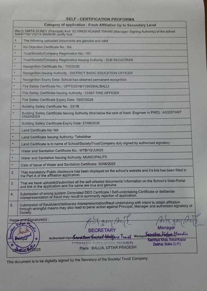 | 4 | COMPLETE ADDRESS WITH PIN CODE | Sanatan vidya mandir,Kachhua khas, Basarikapur, Dubhar, Ballia, Uttar Pradesh 277401 |